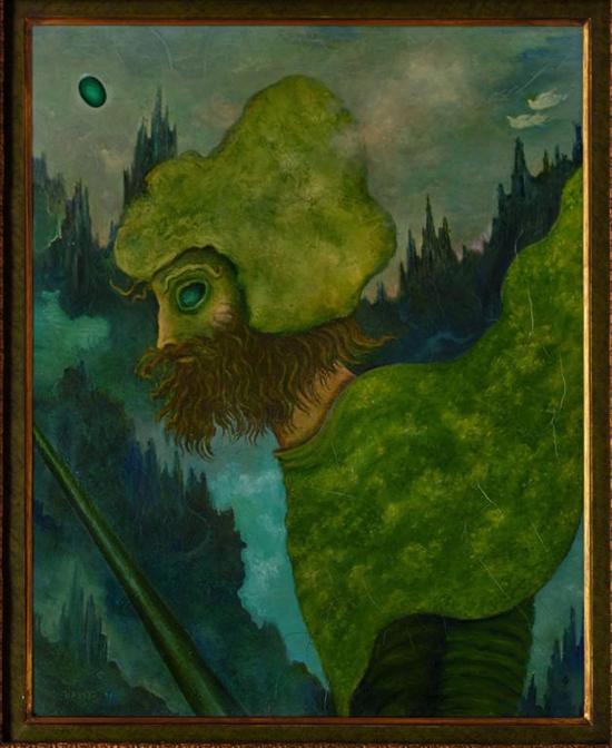 SOFÍA BASSI El hombre leyenda Firmado y fechado 1991. Óleo sobre masonite. Con certificado de autenticidad de Franco Bassi. Agradecemos a Franco Bassi por la verificación de autenticidad de esta obra, septiembre de 2011. Expuesto en: "El hombre leyenda" en el Centro de Cultura Casa Lamm, en 1998. "Conocer a Sofía Bassi es asomarse al mundo de lo irreal que sólo una imaginación desbordada como la suya puede concebir y trocar en cuadros de formas abstractas o de figuras que evidencían sentimientos íntimos y profundos incontables como el fondo mismo de los océanos." Jorge Barreto Hernández. 80 x 65 cm Estimado $90,000-120,000