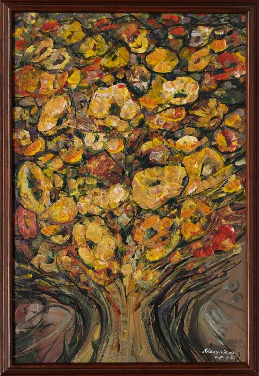 Subasta 612, Lote # 39 DAVID ALFARO SIQUEIROS Ramo de Flores Firmado y fechado C.P. 62. Piroxilina sobre masonite. Ensayo Documental por Irene Herner Reiss. En los cientos de víctimas de la injusticia y la voracidad que Siqueiros pintó en el transcurso de su vida, se actualiza el sentido redentor del cristianismo actualizado por la ideología comunista con la que él se comprometió. Pero Siqueiros el artista, el hombre vital y optimista, entrelazó las formas del sacrificio con otra forma constante en su obra: los árboles, los paisajes telúricos y apocalípticos, que pueden verse en la reciente exposición Siqueiros Paisajista, y las flores. Pintó diversos cuadros que representan árboles o ramos de flores. Flores para darle a su mujer, ya que no podía regalarle flores frescas. Flores que le permitían a su imaginación recuperar el campo negado y flores pintadas con las que podía sostenerse económicamente en la terrible y cara cárcel de Lecumberri entre 1960 y 1964. Se tiene poca información acerca de la proveniencia de esta pintura. Sin embargo, la observación cuidadosa de la misma, sobre todo después de remover el marco, nos llevan a pensar que se trata de una obra de Siqueiros, la cual además está firmada y fechada C.P. (cárcel preventiva), 1962. Las flores rebasan el marco del cuadro y cubren toda la superficie como si quisieran así recuperar el espacio perdido en una celda carcelaria de dos por tres. Recuerdan a las flores del campo que parecen volar con la brisa, hechas de "accidentes" controlados, manchas lanzadas al soporte que el pincel reconforma con trazos temblorosos y expresionistas. Sin embargo, brochazos secuenciados de abajo hacia arriba le ofrecen a esta imagen volátil su sólida estructura compositiva. Se trata de trazos obscuros que revelan y esconden tallos verticales e inclinados. Nos encontramos ante una masa de flores entre las cuales se asoman payasos sonrientes, o caritas llorosas. Cada flor es diferente y en su conjunto vibran y parece que rebasan el soporte. El colorido de las flores es de una combinatoria infinita, que pone en el mismo plano los blancos y negros con los turquesas, los grises, los amarillos, los morados y los rojos. Como corolario, en la parte posterior de la pintura, Siqueiros realiza una pequeña composición juguetona, a partir de las manchas de pintura que accidentalmente quedaron marcadas. Se trata de una deliciosa composición casi abstracta, libre y al azar. Octubre 12, 2011. Referencia: Libro "Siqueiros del Paraíso a la Utopía" por Irene Herner Reiss. México, 2da ed. Miguel Ángel Porrúa, 2010. 66.2 x 44.3 cm Estimado $450,000-500,000