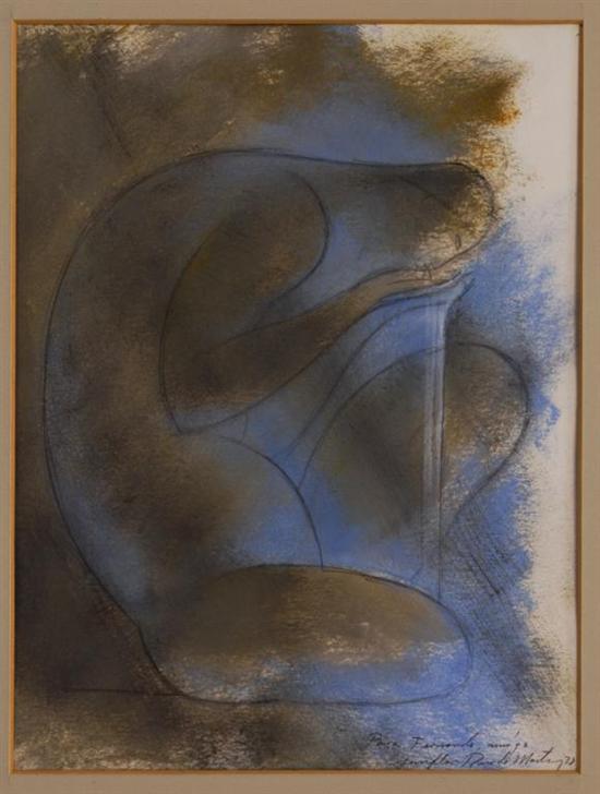 Subasta 612, Lote # 1 RICARDO MARTÍNEZ Sin título (Boceto azul con agua) Firmado y fechado 78. Óleo sobre papel. Con etiqueta del INBA - Oficina de Registro de Obras. Aparece en: "Ricardo Martínez." Joaquín Mortiz. 1981. Catalogado #147. Con dedicatoria: "Para Fernando, amigo ejemplar." Esta obra tiene el número de registro RM-78010 en el archivo del Dr. Mark Ruben. Procedencia: Galerías A. Cristobal. Colección particular ciudad de México. (N. Ciudad de México, 1918 - Ciudad de México, 2009) De cierta manera su obra nos remonta a las figuras precolombinas de las culturas Maya y Olmeca, por el carácter escultórico que encierra su pintura. Otro de los atributos más notables de su obra es el hecho de que permite sustraer de ella los sentimientos más sutiles, que se hacen evidentes conforme el espectador observa los cuadros y se encuentra en el profundo amor de los amantes, el remanso renovador después de la pasión sexual, el abrazo candoroso de una madre y la reflexión del hombre ante su existencia, todos ellos expresados con gran poesía y color. Véase: LARA ELIZONDO, Lupina "Visión de México y sus Artistas. Tomo I." México. Promoción de Arte Mexicano, 2000. pp. 254-255. 28.5 x 21.5 cm Estimado $100,000-150,000