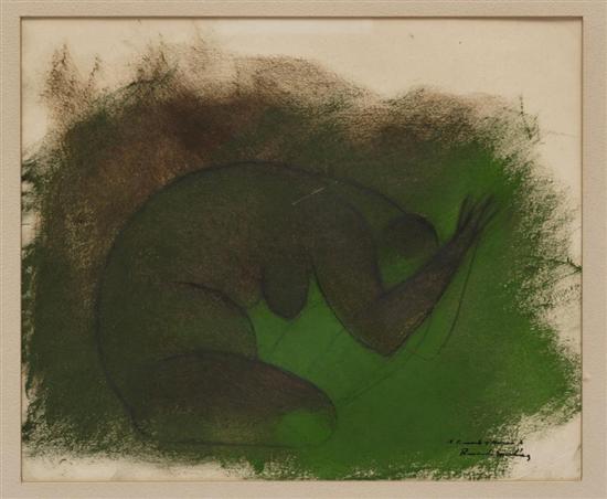 RICARDO MARTÍNEZ Sin título (Boceto verde), 1975 Firmado. Óleo sobre papel. Con etiqueta del INBA - Oficina de Registro de Obras. Aparece en: "Ricardo Martínez." Joaquín Mortiz. 1981. Catalogada #144. Esta obra tiene el número de registro RM-75009 en el archivo del Dr. Mark Ruben. Con dedicatoria: "a Fernando y Georgina." Procedencia: Galerías A. Cristobal. Colección particular ciudad de México. Presenta detalles de conservación leves. 23.5 x 28.5 cm Estimado $100,000-150,000