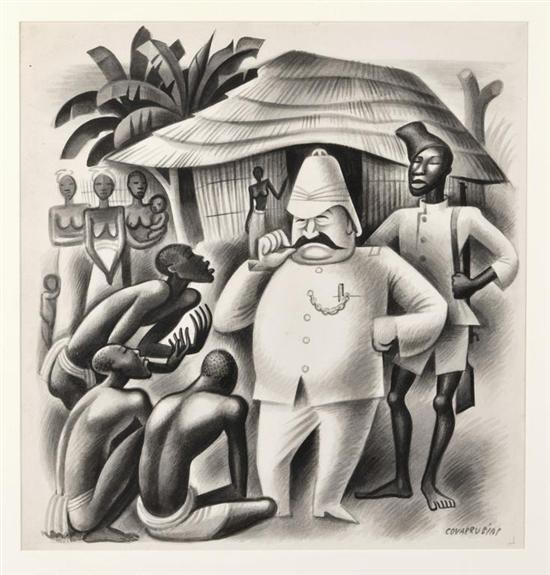 MIGUEL COVARRUBIAS Sin título (Esclavos y coronel) Firmada. Acuarela sobre papel. Procedencia: Galerías A. Cristobal. Colección particular ciudad de México. "Especialmente importante es la presentación delas relaciones ecológicas y humanas. El enfoque pictórico se proyecta sobre los personajes y la delineación específica de sus artefactos culturales. Con técnicas tales como el énfasis y la distorsión, tomadas del arte de la caricaturaen el cual él era maestro, Covarrubias añade una pizca de humor al nuevo vocabulario visual que inicia en la representación de sus mapas. La adición de un aura emocional, la mezcla visual de datos geográficos y etnológicos continúan siendo únicas en la historia de la cartografía. Véase: NAVARRETE, Sylvia. "Miguel Covarrubias." México. CONACULTA-UDLA, 2004 26.5 x 25.5 cm Estimado $130,000-180,000