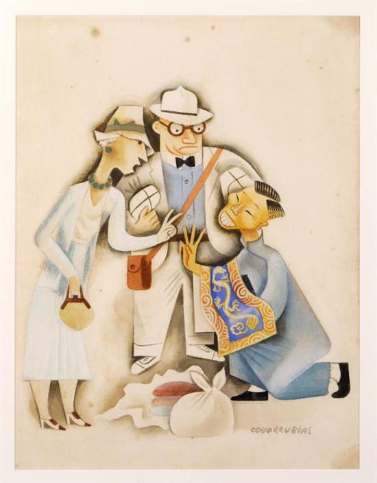 MIGUEL COVARRUBIAS Sin título (Turistas y chino) Firmada. Acuarela sobre papel. Procedencia: Galerías A. Cristobal. Colección particular ciudad de México. Presenta manchas en el papel. (N. Ciudad de México, 1904 - 1957) La dislocación de los planos a la manera cubista, la abstracción cada vez más rotunda y la simplificación geométrica de las formas, lo distinguen como uno de los antecedentes del cambio estático de las formas experimentado por la caricatura moderna, ya no considerada un arte secundario ni un género sin trascendencia. "Con él la caricatura prescinde de la imitación como finalidad y como método para convertirse en mirada analítica que deriva nuevos trazos, proporciones y signos de su modelo precedente." Miguel Ángel Echegaray, 1997. Véase: NAVARRETE, Sylvia. "Miguel Covarrubias." México. CONACULTA-UDLA, 2004 31 x 23 cm Estimado $130,000-180,000