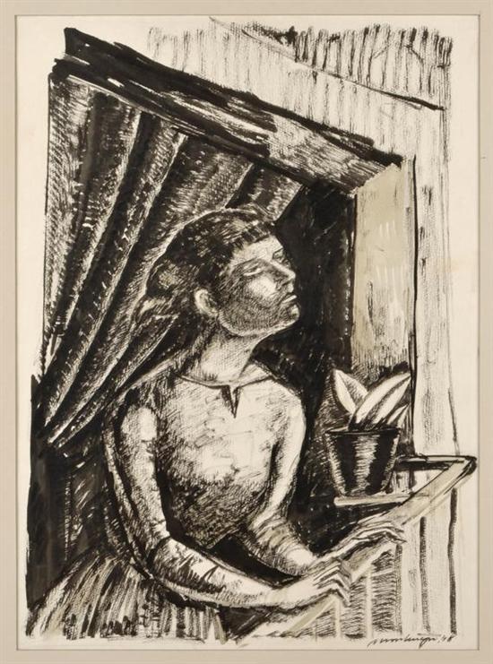 ROBERTO MONTENEGRO Mujer en balcón Firmada y fechada 48. Tinta sobre papel. Con etiquetas de MUNAL y Collection Rockefeller. Procedencia: Galerías A. Cristobal. Colección particular ciudad de México. 44 x 32 cm Estimado $120,000-200,000