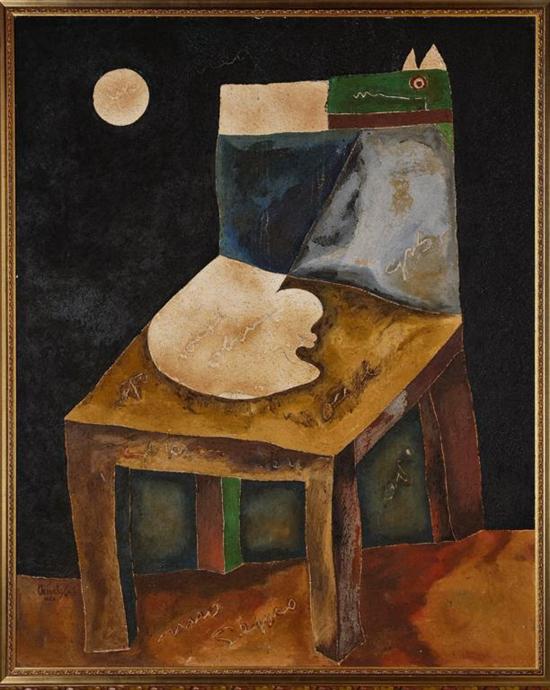 Subasta 612, Lote # 130 JAVIER ARÉVALO Abstracto (Silla) Firmada y fechada 89. Mixta sobre tela. Con etiqueta del Instituto Nacional de Bellas Artes. (N. Guadalajara, Jalisco, 1937 - ) Arévalo, dice que cada mañana despierta con la idea de no haber pintado nada el día anterior, "para no copiarse", opina que las situaciones sociales cambian el abordaje de la pintura, porque "a veces uno toca temas simples y luego se complica pensando cómo comunicar las malas noticias que pasan a diario." Para el jaliscience, lo más importante de su pintura no es la experimentación sino la firmeza y la perfección en los trazos a partir de un pensamiento previo: "Yo soy muy directo así que no necesito bocetear. Si mi trabajo gusta o no, eso ya no me corresponde a mí decirlo." Con la inquietud a flor de piel, el artista reitera que su aportación a la pintura mexicana es el interés por seguir inventando para que no le pase como con el trabajo de algunos colegas consagrados que con ver los primeros cuadros ya se ha visto todo. Véase: GARCÍA, Adriana. "Soy un pintor con vocación de reportero: Javier Arévalo." México. Diario El Universal, 28 de julio de 2000. 160 x 200 cm Estimado $120,000-150,000