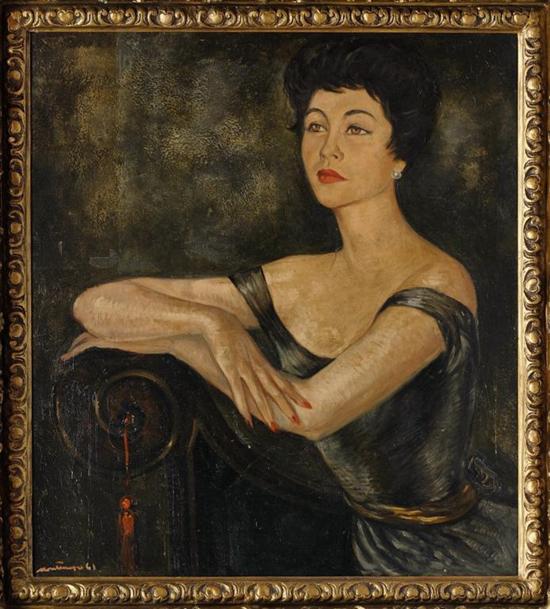Subasta 612, Lote # 31 ROBERTO MONTENEGRO Retrato de la Sra. Mercedes Azcárate Firmado y fechado 1961. Óleo sobre tela. (N. Guadalajara, Jalisco, 1885 - Pátzcuaro, Michoacán, 1968) Desde 1923 o 1924, Montenegro "traslada al lienzo" los rostros de las personalidades y, con frecuencia, los semblantes y las pretensiones de las señoras de sociedad, los magnates, los políticos, las Glorias Nacionales, los artistas. Pinta retratos magníficos donde capta a personajes notables por su obra o su trayectoria: el pintor Chucho Reyes, Dolores del Río, el doctor Gustavo Baz, Frida Kahlo, entre muchos otros. En 1967 Montenegro recibe el Premio Nacional de las Artes. Muere al año siguiente. Lo mejor de su obra, tan vasta y tan dispersa, continúa esperando la revaloración que merece y que enriquecerá las visiones del arte mexicano, tan beneficiado por esta personalidad singular. Véase: MONSIVÁIS, Carlos. "Roberto Montenegro. El pintor muy conocido, el gran artista desconocido." en: "Roberto Montenegro. La sensualidad renovada.". México. Fondo Editorial de la Plástica Mexicana, 2001. pp. 17 y 18. 90 x 80 cm Estimado $120,000-150,000