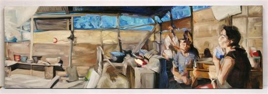 MIGUEL ÁNGEL GARRIDO Tatiana en la cocina de Emilia y Juanito Firmado y fechado 10. Óleo sobre tela. Agradecemos a Aldama Fine Art por la verificación de autenticidad de esta obra, septiembre de 2011. Publicada en: "Miguel Ángel Garrido. Todos nuestros fantasmas." México. Aldama Fine Art, 2010. Catalogada 17. (N. Ciudad de México, 1982 - ) "Garrido es un típico representante del regreso de la pintura pero no en sus formas actuales. Su ubicación en el complejo mundo de la pintura de los últimos ciento veinte años es tradicional y desde ahí se aproxima a las nuevas propuestas. Miguel Ángel se deja permear por Francis Bacon, se detiene en su expresionismo neofigurativo y en ocasiones lo reconvierte hacia la abstracción total o parcial". Lelia Driben. Historiadora y crítica del arte. 70 x 220 cm Estimado $45,000-60,000