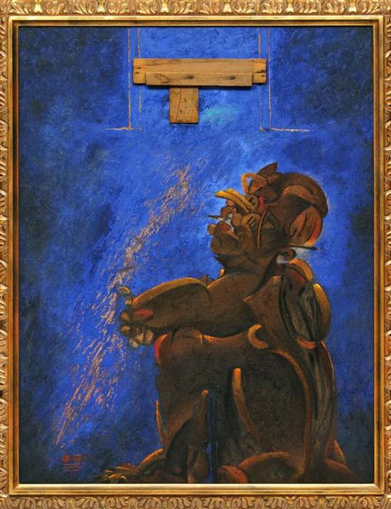 Subasta 612, Lote # 136 ARTURO ZAPATA Estrella de madera Firmado con monograma. Óleo sobre tela. Agradecemos a Aldama Fine Art por la verificación de autenticidad de esta obra, septiembre de 2011. Publicada en: "Arturo Zapata. Pintura, dibujo y estampa." Aldama Fine Art. México, 2007. Catalogada 17. (N. Ciudad de México, 1951 - Ciudad de México, 2011) "El quehacer de Zapata denota el ensimismamiento de alguien a quien le gusta viajar al fondo del detalle, ampliando las formas, asumiendo un viaje fantástico y elaborando close-ups en los que cada elemento protagónico define sus encuadres, unas veces entrelazándose con los espacios que lo circundan, otras adueñándose del primer plano. […] En "Estrella de Madera" un personaje a la manera de la escultura prehispánica, yace en cuclillas; su cuerpo de tonos cálidos dirige su mirada hacia la parte superior del cuadro, observando unos trozos de madera que forman una "t" asimétrica, la estrella aludida. Aquí la conexión es entre el ayer y el hoy, entre el personaje y el trozo de madera, entre el pasado que añora al futuro, donde el espectador participa activamente, aportando con su mirada la carga del presente efímero." Sofía Neri Fajardo. Historiadora y crítica del arte. 120 x 90 cm Estimado $90,000-120,000