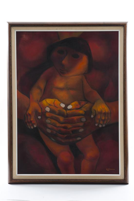 EDUARDO KINGMAN El hijo Firmado y fechado 83, al frente y reverso. Óleo sobre tela. Procedencia: Adquirido directamente al artista. (N. Loja, Ecuador, 1913 - Quito, Ecuador, 1997) Fue miembro fundador de la Casa de la Cultura y abrió la primera galería de arte en Quito. Viajó a EE.UU para pintar el mural de Ecuador en la Feria Mundial en Nueva York, y decidió quedarse un tiempo ahí. Sus cuadros fueron adquiridos por el museo de San Francisco y expuso en el Newark Museum junto a importantes artistas de ese tiempo. En 1949 es nombrado director de Patrimonio Cultural y del Museo de Arte Colonial de Ecuador. En los años cincuenta su obra atraviesa permanentes innovaciones y se alza como uno de los más grandes creadores de América Latina. 90 x 65 cm Estimado $220,000-300,000