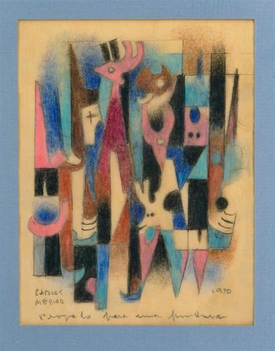 CARLOS MÉRIDA Proyecto para una pintura Firmado y fechado 1970. Lápices de colores sobre papel albanene. (N. Guatemala, 1891 - Ciudad de México, 1984) "El mundo prehispánico alcanza en Carlos Mérida la perfección de la síntesis y la sublimación del ritmo numérico surgido de la geometría. La deuda que la pintura abstracta de nuestro tiempo tiene con Carlos Mérida es por ello tan grande como sólida y siempre actual su obra." Salvador Novo. 16.5 x 12.5 cm Estimado $70,000-90,000