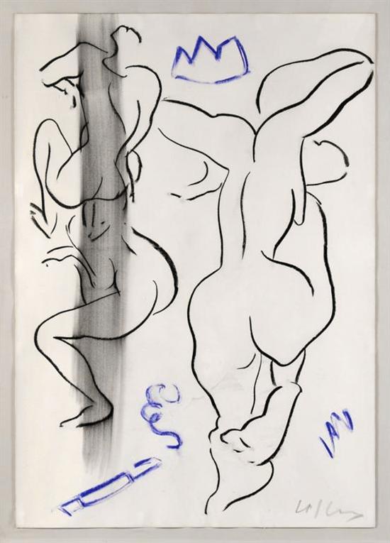 Subasta 612, Lote # 147 FERNANDO LEAL AUDIRAC Desnudos con Montblanc Firmado. Carbón y pastel sobre papel. Publicado en: BRETTELL, Richard R., Et al. "Fernando Leal Audirac. Obra de 1975 a 1993." Espejo de Obsidiana Ediciones, 1993. Pág. 244, catalogado 71. (N. Ciudad de México, 1958 - ) "Mi primera reacción ante el deslumbrante virtuosismo verbal de Leal Audirac fue la desconfianza. Se mostró tan ávido, seguro e inteligente en su juego de ideas, que sentí cierta sospecha, temor de estar ante la presencia de un artista brillante pero fraudulento, Los únicos trabajos artísticos originales que había visto eran sus dibujos a pluma a la manera de Matisse, obras que habían sido "trazadas de golpe" por un virtuoso de la pluma, así como sus palabras provenían de un virtuoso de la mente. Por supuesto que mi desconfianza y sospechas iniciales pronto dieron cabida a un respeto por este talento torrencial, cuya energía interna no se entorpecía ante la duda, la culpa o el ensimismamiento. Yo quería, y necesitaba, ver más." Richard Brettell, "Imágenes e Ideas". 100 x 70 cm Estimado $50,000-60,000