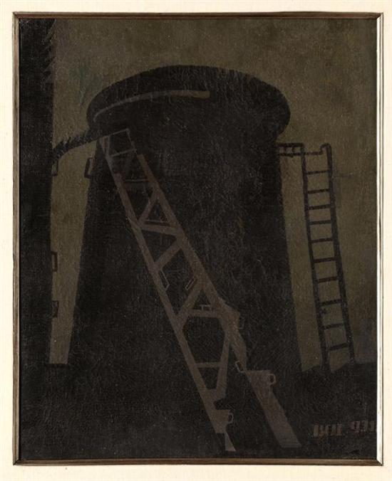 Subasta 612, Lote # 63 FERMÍN REVUELTAS Símbolos de lucha y la industria, Tanque de almacenamiento, 1931 Sin firma. Óleo sobre tela. Con certificado de autenticidad de Galería de Arte Misrachi, Junio 2009. Exhibido: En "Fermín Revueltas y los Estridentistas", 25 de Agosto al 30 de Septiembre de 2005, Instituto de Artes Gráficas de Oaxaca (IAGO), Oaxaca, México. (N. Santiago Papasquiaro, Durango, 1901 - Ciudad de México, 1935) Si bien su obra monumental y de caballete equilibró un discurso colorístico con uno compositivo, su producción editorial logró la abstracción de las formas monocromáticas. El simbolismo de sus diseños correspondió al lenguaje de la modernidad, y aún cuando sus viñetas e ilustraciones hayan derivado en diversas temáticas sociales e históricas, la síntesis de su expresión mantiene, hoy por hoy, una vigencia artística propositiva y sugerente. Véase: ZURIÁN, Carla. "Fermín Revueltas. Constructor de Espacios." México. Editorial RM - INBA. 2002. 40.5 x 33 cm Estimado $40,000-50,000