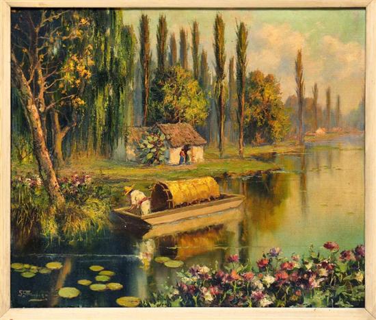GUILLERMO GÓMEZ MAYORGA Trajinera en Xochimilco Firmado. Óleo sobre tela. (N. Puebla, 1887 - 1962) Sus paisajes fueron realizados del natural, el artista salía al campo cargando sus materiales para escoger el sitio perfecto. Trazaba líneas, preparaba los fondos y con paciencia esperaba la hora exacta en la que los colores se contrastan, aquel momento en el que aparecen sombras bien marcadas y el sol crepuscular crea un ambiente digno de un espectáculo. Ese instante en el que la luz juega con los tonos dorados, los colores cobrizos y anaranjado, las nubes y los cielos se tiñen, las montañas se obscurecen pasando de los verdes intensos a los morados. Véase: LARA ELIZONDO, Lupina. "Resumen Pintores y Pintura Mexicana." México. Promoción de Arte Mexicano. Agosto 2007. Año 3 No. 32. 55 x 65 cm Estimado $220,000-300,000