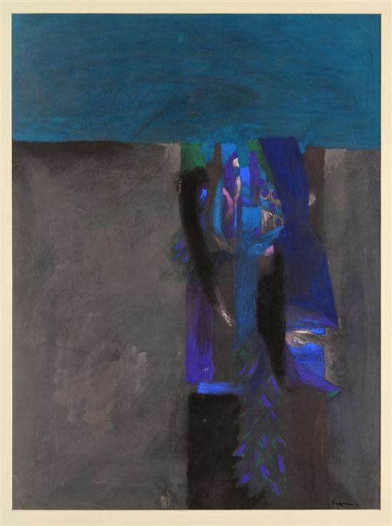 Subasta 612, Lote # 67 FERNANDO DE SZYSZLO Estudio No. 5 Firmado. Gouache sobre papel. Con certificado de autenticidad de la Galería Juan Martín, 20 de Septiembre de 1973. (N. Lima, Perú, 1925 - ) Se formó en la Escuela de Artes Plásticas de la Universidad Católica de Lima. A los 24 años viajó a Europa donde estudió las obras de los grandes maestros, en particular de Rembrandt, Tiziano y Tintoretto y absorbió las variadas influencias del cubismo, surrealismo, informalismo y abstraccionismo. Fue una figura clave en el arte abstracto de la Latinoamérica de mediados de los 50. Durante su estancia en París conoció a Octavio Paz y André Bretón y frecuentó el grupo de escritores e intelectuales que se daban cita en el Café Flore, organizando tertulias para decidir como participar en el movimiento moderno internacional al tiempo que preservaban su identidad cultural latinoamericana. Hasta su regreso a Perú, Szyszlo fue una de las mayores fuerzas en la renovación artística de su país, abriendo camino mediante la expresión de temáticas peruanas en un estilo no representacional. "Fernando de Szyszlo absorbió la experiencia de la vanguardia europea y la transformó en otra vanguardia, ajena a las escuelas y a los esquemas. Hablar de surrealismo o de abstraccionismo sería una simplificación, pero su trabajo se ha enriquecido en el contacto con ambas tendencias, consideradas, precisamente, como proposiciones de trabajo." Jorge Edwards. Véase: "Fernando de Szyszlo. Elogio a las Sombras." México. Antiguo Colegio de San Ildefonso, 2011. 74.5 x 55.cm Estimado $60,000-80,000
