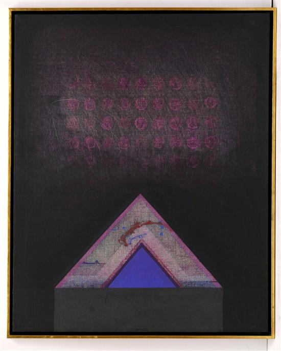 VICENTE ROJO Señal con triángulo morado Fechado México 1970, al reverso. Óleo sobre tela. Con certificado de autenticidad de la Galería Juan Martin, 20 de Septiembre de 1973. El signo más profundo en la pintura de Vicente Rojo es: destruir para construir, construir mediante la destrucción. Por eso sus obras no pueden ni quieren estar referidas más que a ellas mismas. Su necesidad es la del artista solo frente a la creación. Su belleza la que ellas hacen posible para sí mismas al entregársenos como resultado de la lucha del pintor. Dentro de ellas, Vicente Rojo va y viene en una y otra dirección en busca de pintura., entregándonos sus respuestas como un resultado de la búsqueda. Véase: GARCÍA PONCE, Juan, "Nueve Pintores Mexicanos." México. UNAM - colección Pértiga, 2006 Segunda edición. pp. 53-57. 100 x 80 cm Estimado $160,000-200,000