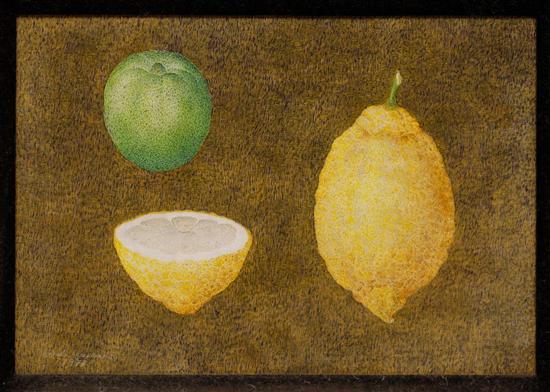 LUIS GARCÍA GUERRERO Sin título (Limón y lima) Firmado y fechado 1977. Óleo sobre masonite. (N. Guanajuato, Guanajuato, 1921 - Ciudad de México, 1996) "Puede decirse que no hay pintor cuya obra se asemeje a la de Luis García Guerrero. Descubrimos que su virtuosismo -equilibrio en el dibujo la composición, el color y el pinceleo- obedece a su disfrute gozoso de la naturaleza y que su arte es el trasunto de la magia inherente de las frutas, los cerros, los insectos, las piedras… Expresión que obtiene gran riqueza por la vibración del color; expresión también de una finísima sensibilidad, herencia legítima de Alfredo Dugés y Hermenegildo Bustos." José Chávez Morado. 28 x 36 cm Estimado $45,000-55,000