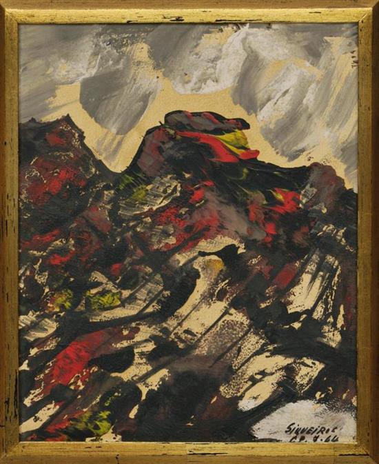 Subasta 612, Lote # 38 DAVID ALFARO SIQUEIROS Paisaje Firmado y fechado C.P. 7. 64. Piroxilina sobre madera. Con certificado y etiqueta de Galería Arvil. Agradecemos a Galería Arvil, por la verificación de autenticidad de esta obra, octubre de 2011. Agradecemos a América Juárez, Jefa de Registro y Control de obra del Museo Carrillo Gil, octubre de 2011. Siqueiros siempre tuvo la inquietud de encontrar nuevos materiales y elementos que ayudaran a la expresión plástica, por lo que en 1936 fundó un taller experimental en Nueva York; en esa época abandonó el uso del óleo por la piroxilina. Durante sus últimos años trabajó intensamente. Abrió dos talleres, uno en Cuernavaca y otro en la Ciudad de México. Ahí acudían una gran cantidad de discípulos que compartían sus investigaciones y propuestas de nuevos conceptos compositivos y metodológicos. Siquieros fue un revolucionario tanto en lo político como en la pintura. Su interés por renovar y aportar cambios quedó plasmada en la siguiente declaración: "No se trata de revolucionar solamente el contenido del arte, sino también la manera de ejecutarlo." Véase: LARA ELIZONDO, Lupina "David Alfaro Siqueiros" en Visión de México y sus Artistas. Tomo I. México. Promoción de Arte Mexicano, 2000. pp. 140-143. 33 x 27 cm Estimado $300,000-350,000