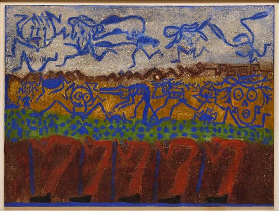 Subasta 612, Lote # 14 SERGIO HERNÁNDEZ Tres cielos de nueve Firmado y fechado 1995 al reverso. Óleo sobre lino. Con certificado de autenticidad de María Elena Blanco. (N. Huajuapan de León, Oaxaca, 1957 - ) "Cada vez más me doy cuenta que pintar tiene que ver más con un movimiento de energía, con un instante, y que consiste en la experiencia en ese instante, no previo, no posterior. No es el resultado, sino es el instante de cómo esa energía se mueve dentro de uno como extensión de la mano, o el escurrir con la mano por medio de un pincel o un gesto con la mano misma. Es un gesto muy íntimo, muy de estado de ánimo en ese momento, y que puede ser ira, pueden ser diferentes sentimientos que se manifiestan." Sergio Hernández. Véase: MACMASTERS, Merry. "Sergio Hernández rompe la parte de lo sagrado de la cura de viento." México. Diario La Jornada, sección Cultura, 31 de marzo de 2007. 97 x 130 cm Estimado $400,000-450,000
