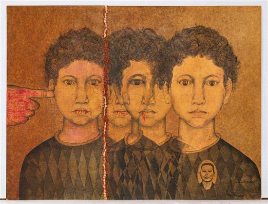 Subasta 612, Lote # 135 NAHUM B. ZENIL Sin título Firmado y fechado 78. Tinta y collage sobre cartoncillo. (N. Chicontepec, Veracruz, 1947 - ) La factura es siempre la misma: finos trazos de tinta sobre papeles sepia, envejecidos como para darles la nostálgica tesitura de lo antiguo, y una cara en el centro, inmutable, que no refleja nada del exterior ni parece afectada por las emociones. De cuadro en cuadro, de retrato en retrato, Nahum organiza variaciones sobre un mismo tema, una farsa mórbida. Diversos elementos contingentes al rostro modifican las apariencias sin alterar la esencia de las cosas, sin conmover a Nahum. Fragmentos de papel pegados, sobrepuestos al "original", conforman una misteriosa composición cuyas partes principales se ocultan deliberadamente. En otra línea, más próxima quizá, Nahum B. Zenil organiza composiciones a partir de sus recuerdos personales. La choza, el perro, los maizales de su infancia en Chicontepec, sus parientes, sus amigos y sus alumnos, surgen en esas imágenes sencillas, especies de retablos conmovedores, con los que celebra anécdotas y paisajes amados. Las contradicciones se desvanecen en estos cuadros en los que una sorda, austera, melancolía, sustituye las motivaciones sexuales. Véase: DEBROISE, Olivier. "Nuestro artista invitado. Nahum, Nahum, Nahum." Texto para la exhibición en Galería de Arte Mexicano, 1985. 50.3 x 65 cm Estimado $30,000-40,000