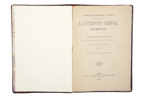 Subasta 714, Lote # 140 CR - Roumagnac, Carlos / García, Jesus Leonardo. La Estadistica Criminal en México / La Verdad en el Asesinato del Padre Morales. a) Roumagnac, Carlos. La Estadistica Criminal en México. México: Imp. de Arturo García Cubas, 1907. 4o. marquilla, 31 p. + 2 cuadros estadísticos. Encuadernado en pasta dura, lomo y puntas en piel. b) García, Jesus Leonardo. La Verdad en el Asesinato del Padre Morales. Puebla: Pedro Carmona, 1952. 8o. marquilla, 232 p. Conserva pastas originales en rústica. Manchas de humedad, p. 231 rasgada. Encuadernado en pasta dura, lomo y puntas en piel. Total de piezas: 2. Estimado $4,000-5,000
