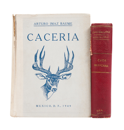 Subasta 714, Lote # 154 EX - López, Carlos M. - López, Carlos / Imaz Baume, Arturo. Caza Mexicana / Cacería. a) López, Carlos M. / López, Carlos. Caza Mexicana. París / México: Librería de la Vda. de C. Bouret, 1911. 8o. marquilla, XIX + 629 p. + 3 h. Obra escrita con la colaboración de varios cazadores del país é ilustrada con retratos y con fotografías tomadas de animales, también del país. Lomo y puntas gastadas. Encuadernado en pasta dura. b) Imaz Baume, Arturo. Cacería. México: Secretaría de Educación Pública, 1949. 4o., 659 p. Ilustrada profusamente con dibujos hechos por el autor. Segunda edición. Cajos quebrados. Encuadernado en pasta dura. Total de piezas: 2. Estimado $8,000-10,000