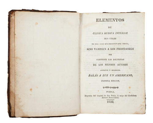 Subasta 714, Lote # 322 ME - Un Americano. Elementos de Clínica Médica interior. Puebla (Mexico): Imprenta del Hospital de San Pedro, a cargo del ciudadano Manuel Buena-Abad, 1832. 16o. marquilla, 2 h. + 438 + 87 p + 2h. ... muy útiles no solo a los que principian esta ciencia, sino también a los profesores por contener las doctrinas de los mejores autores antiguos y modernos. Primera edición. Al final: "Replica contra la division de cirugia y medicina, y la cuestion subalterna sobre si los cirujanos como son, pueden considerarse como verdaderos medicos. Leída y pasada a su censura por Luis Guerrero a la Academia Medico-Quirurgica de Puebla el 13 de abril de 1833." Sin cofia, sin pie, pastas gastadas. Encuadernado en pasta dura, en piel. Estimado $8,000-10,000