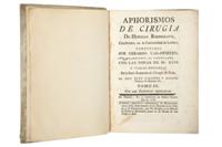 ME - Boerhaave, Herman. Aphorismos de Cirugia. Madrid: En la Imprenta de Pedro Marín, 1774 - 1779. 8o. marquilla, 4 h. + 457 p.; 2 h. + 504 p.; 2 h. + 552 p. Comentados por Gerardo Van - Swieten, y traducidos al castellano, con notas de Mr. Luis y varias Memorias de la Real Academia de Cirugía de París, por Juan Galisteo y Xiorro. Tomos II - IV. Tomo II - Con una lámina plegada (grabado). Tomo III - Con dos láminas plegadas (grabados); picado, afecta poco texto y láminas. Tomo IV - Con dos láminas plegadas (grabados). Encuadernados en pergamino. Piezas: 3. Estimado $4,000-6,000