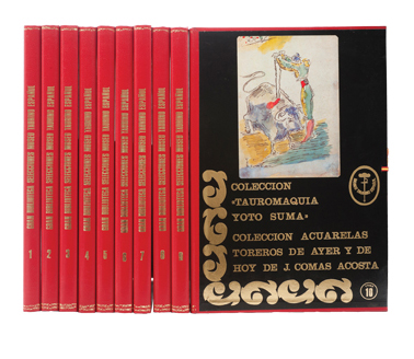 CH - Horna López, Antonio de.Gran Biblioteca de Selecciones del Museo Taurino Español. Madrid: Misterio de Cultura, 1977. fo. doble marquilla. Tomo I - Galería de Toreros Españoles Famosos I. Tomo II - Galería de Toreros Españoles Famosos II. Tomo III - Galería de Toreros Famosos. Tomo IV - Documentos Inéditos (Corrida 1842 Madrid). Tomo V - Selección de Cartelería Antigua Siglo XVIII y XIX. Cuadros Estadísticos. Temporadas Taurinas. Joselito 1913-20. Tomo VI - Selección de Obras Maestras del Museo Taurino Español I. Tomo VII - Selección de Obras Maestras del Museo Taurino Español II. Tomo VIII - Momentos Estelares. Tauromaquia de Juan Belmonte. Colección de Monotipos de Ruiz Morante. Tomo IX - Colección "Momentos más Importantes de una Corrida de Toros (Antonio Carnicero 1790). Tomo X - Colección "Tauromaquia Yoto Suma". En estuches de pasta dura, lomo en piel. Piezas: 10. Estimado $6,000-8,000