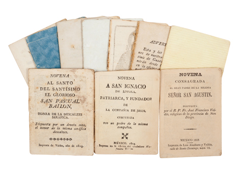 Subasta 714, Lote # 340 R - Colección de Novenas. México, Siglos XVIII y XIX. a) Novena del Gloriosissimo Martyr S. Jorge. México: Herederos del Lic. D. Joseph de Jauregui, 1779. 32o. marquilla, 16 h. Patrón y abogado contra las mordeduras, ó picadas de Animales ponzoñosos. Picado, afecta ligeramente el texto. Encuadernado en rústica. b) Novena al Santo del Santísimo el Glorioso San Pascual Bailon. [México:] Imprenta de Valdés, 1823. 32o. marquilla, 16 h. Con un grabado. Sin pastas. c) Novena a San Ignacio de Loyola, Patriarca y Fundador de la Compañia de Jesus. Mexico: Impresa en la oficina de Alejandro Valdés, 1824. 32o. marquilla, 16 h. Con un grabado. Sin pastas. d) Obsequio para Venerar el dia Cuatro de Cada Mes al Padre y Patriarca de Predicadores, señor Santo Domingo de Guzman. México: Impreso en la oficina de la testamentaria de Ontiveros, 1826. 32o. marquilla, 1 h. + 30 p. Con un grabado. Primera hoja por desprenderse. Sin pastas. e) Novena al Glorioso San Nicolas, Milagroso Arzobispo de Mira. México: Imprenta del C. Alejandro Valdés, 1827. 32o. marquilla, 15 h. Con guardas. f) Ejercicio para Acompañar a Jesucristo Ntro. Señor con la Cruz a Cuestas. México: Imprenta de Luis Abadiano y Valdés, 1836. 32o. marquilla, 32 p. Con un grabado. Encuadernado en rústica. g) Dia Diez y Seis Consagrado al Sr. S. Juan Nepomuceno. México: Imprenta de Luis Abadiano y Valdes, 1836. 32o. marquilla, 28 p. Con un grabado, por desprenderse. Incompleto, faltan 2 hojas. Sin pastas. h) Novena en Obsequio del Gran Padre y Doctor Maximo de la Iglesia San Geronimo. México: Oficina del ciudadano Alejandro Valdés, 1833. 32o. marquilla, 32 p. Con un grabado. Encuadernado en rústica. i) Devocion á Dios Nuestro Señor y a su Santísima Madre Señora Nuestra. México: Imprenta de Luis Abadiano, 1850. 32o. marquilla, 3 h. + XXII p. Encuadernado en rústica. j) Novena Consagrada al Gran Padre de la Iglesia Señor San Agustin. México: Imprenta de Luis Abadiano y Valdés, 1853. 32o. marquilla, 32 p. Con un grabado. Sin pastas. Total de piezas: 10. Estimado $6,000-8,000