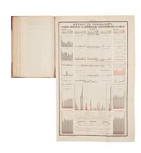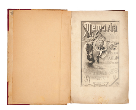 MM - Obregón González, Joaquín. Memoria sobre la Administración Pública del Estado de Guanajuato. Morelia: Imprenta y Litografía de la Escuela L. M. Porfirio Díaz, [1895?]. Folio, Frontispicio + XXXVIII p. + 264 láminas plegadas (estados, cuadros, notas, etc.) + 22 láminas (litografías) + Apéndice que contiene 12 datos y cuadros referentes al censo (algunos plegados) + 16 láminas (litografías) + 6 h. de índice. Presentada al Congreso del mismo el 1o. de abril de 1895. Litografías de la Escuela L. M. Porfirio Díaz, algunas en sepias. Puntas gastadas y pequeño faltante en cajo anterior. Encuadernado en pasta dura en yute, con tejuelo y puntas en piel. Worldcat registra un sólo ejemplar en bibliotecas de instituciones. Estimado $18,000-25,000