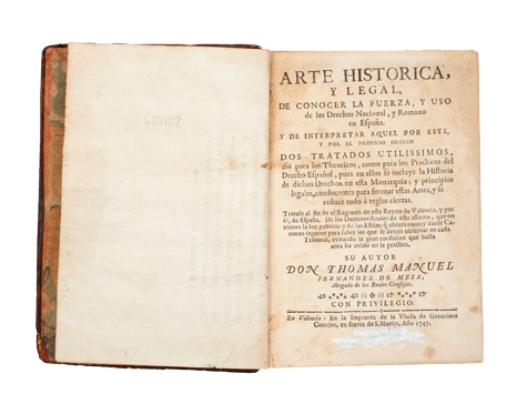 Subasta 714, Lote # 144 D - Fernández de Mesa, Thomas Manuel. Arte Historica y Legal de Conocer la Fuerza y Uso de los Drechos Nacional y Romano en España. Valencia: En la Imprenta de la Viuda de Jerónimo, 1747. 8o. marquilla, 16 h. + 172 + 212 p. Dos tratados utilissimos, assi para los Theoricos, como para los practicos del Drecho Español, pues en ellos se incluye la Historia de dichos Drechos en esta Monarquia; y principios legales, conducentes para formar estas artes, y se reduce todo à reglas ciertas. Tratase al fin de el Regimen de este Reyno de Valencia, y por èl, de España. De los Decretos Reales de este assunto, que no vieron la luz publica y de los Estilos q observamos; y danse Canones seguros para saber los que se deven observar en cada Tribunal, evitando la gran confusion que hasta aora ha avido en la practica. Portada con sello de antiguo propietario cubierto con corrector. Picado, algunos orificios con cinta adhesiva. Sin cofia, sin pie, cajos quebrados, lomo con faltantes y gastado, pastas gastadas. Encuadernado en pasta dura, en piel. Estimado $6,000-8,000