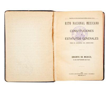 Subasta 714, Lote # 346 R - Guzmán, Manuel. E. Rito Nacional Mexicano (Registro Personal). México: 1927 - 1934. 8o. marquilla. Contiene: a) Rito Nacional Mexicano. Constituciones y Estatutos Generales para el Gobierno del Simbolismo. México: Talleres Gráficos "Soria", 1927. 80 páginas. b) Rito Nacional Mexicano. Constitución y Estatutos Generales. México: Talleres Gráficos "Soria", 1927. 32 páginas. c) Grandes Constituciones de 1º. de Mayo de 1786. Gran Valle de México: Imprenta de "El Siglo Diez y Nueve", 1892. 34 páginas. Concordadas con las que promulgó el Congreso Escocés en Lausanne, el 22 de Septiembre de 1875. Portada rasgada en margen inferior. d) Compendio de la Monita Secreta de los 33 Grados del Rito Antiguo Aceptado Escocés. Gran Valle de México: Imprenta de "El Siglo Diez y Nueve", 1892. 8 páginas. e) Rito Escocés Antiguo y Aceptado. Tejador de los XXXIII Grados. Sin portada. 22 páginas. Con notas manuscritas en tinta. f) Rito Nacional Mexicano. Liturgia del Primer Grado. México, 1934. 56 páginas. Mandada observar por el Supremo Gran Oriente del Rito. g) Liturgia del Segundo Grado. México: Talleres Gráficos "Soria", 1931. 29 páginas. Mandada observar por el Supremo Gran Oriente del Rito. h) Liturgia del Tercer Grado. México: Talleres Gráficos "Soria", 1932. 47 páginas. Mandada observar por el Supremo Gran Oriente del Rito. i) Guzmán, Manuel E. - "Notas Manuscritas". 16 hojas. Incluye registro de grados comenzando desde 1914, hasta alcanzar el grado 33 de Gran Inspector General en 1922. También incluye un registro de puestos, representaciones y cargos, apuntes sobre los diversos rituales, moral y disciplina masónicas, proscripción del Poinsettismo etc. - "Ritual Manuscrito". 43 hojas. Al final: "Juro que las transcripciones que anteceden son absolutamente exactas. México, Octubre 4 de 1936. Gran Luminar Gran Maestro de la Orden. M. E. Guzmán". Con selllos del Rito Nacional Mexicanos y de Manuel Esteban Ramírez. Sin pie y lomo gastado. Encuadernado en pasta suave. Estimado $10,000-12,000