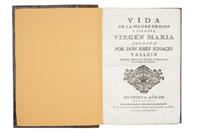 R - Vallejo, Josef Ignacio. Vida de la Madre de Dios y Siempre Virgen María. Cesena: Imprenta de Gregorio Biasini, 1779. 4o. marquilla, 532 p. Primera página rasgada, manchas de óxido. Encuadernado en pasta dura, lomo en piel. Estimado $3,000-4,000