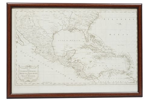 Subasta 714, Lote # 170 G - Kitchin, Thomas.Map of the European Settlements in Mexico or New Spain an the West Indies. Published by T. Cadell according to Act of Parliament May ft., 1783. Mapa grabado, 31 x 51 cm. Margenes superior y laterales recortados. Rasgado y restaurado. Enmarcado. Mapa detallado y extenso, abarca todo el sur de Estados Unidos hasta las Carolinas en el Cabo Henry. El mapa continúa a través de la región llamada "el Gran Espacio de Tierra Desconocida", hasta el extremo de Baja California. Se muestra todo el Caribe, nombrando a las Grandes Antillas, Cuba, las Bahamas, con las islas de Barlovento y Sotavento siendo llamadas Caribbee Is. Llena de nombres de lugares y ríos y un gran número de tribus indígenas. Estimado $4,500-5,500