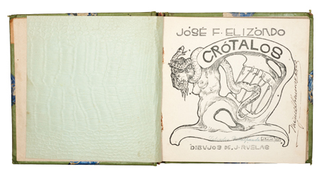 Subasta 714, Lote # 247 L - Elizondo, José F. / Ruelas, Julio (Ilustró). Crótalos. Sin pie de imprenta. [México: 1903]. 16o. marquilla, 111 p. Conserva pastas originales en rústica, ilustradas en negro con dorado por J. Ruelas. Con sellos y nombres de antiguos propietarios. Cofia, pie y lomo ligeramente dañados. Encuadernado en pasta dura. Los primeros versos de José F. Elizondo aparecieron publicados en Revista Moderna: "el joven José se incorpora a través de su pariente Jesús Contreras, el escultor de la "Malgré Tout" de la Alameda a los cenáculos de la Revista Moderna, en cuya redacción puede estrechar las manos más inspiradas de la comarca porfiriana: Rubén M. Campos, Nervo, Urueta, Tablada, J. Ruelas y donde se hace a la costumbre de alternar la rima con la fiesta. De esta época proviene su primer libro de poemas Crótalos (1903), ilustrado por Julio Ruelas. Aunque no se menciona en el colofón, se cree que el tiraje fue de no más de 100 copias. Véase: El país de las tandas. Teatro de Revista (1900-1940). Museo Nacional de Culturas Populares, Dir. Gral. de Culturas Populares, Subsecretaría de Cultura SEP, México, 2a. edición, 1996. Página 15. Por muchos considerados el primer libro "auténticamente modernista" impreso en México. Véase: Mata, Rodolfo. Instituto de Investigaciones Filológicas, Universidad Nacional Autónoma de México. Lit. Mex. Vol. 22, No.1, México, mayo 2011. En México se conocen sólo 2 copias en bibliotecas públicas (WorldCat, 2014). Estimado $8,500-10,000