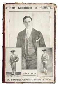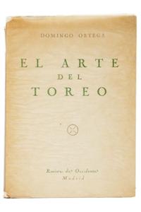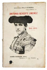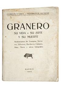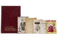 Subasta 714, Lote # 123B T - Alcázar, Federico M. / Díaz Pumarino, Carlos / Carrión, Ginés (Editor) / Serrano García-Vao, M. / Ortega, Domingo / Linares, Agustín. Granero. Su Vida, su Arte y su Muerte / Man vs Beast / Antonio Reverte Jimenez / Historia Taurómaca de Ricardo Torres / El Arte del Toreo / Los Toros en España y México. a) Alcázar, Federico M. Granero. Su Vida, su Arte y su Muerte. Madrid: 1922. 16o. marquilla, 63 p. Ilustraciones de Campúa, Serrano, Alfonso, Barberá, Cámara, Díaz, Marín y otros fotógrafos. Manuel Granero y Valls nació en Valencia en 1902 y murió el 7 de Mayo de 1922 por el toro Pocapena. Sin pastas. Encuadernado en rústica. b) Díaz Pumarino, Carlos. Man vs Beast. México: Inter - American Tourist Bureau of Information, sin año. 16o. marquilla, 24 h. sin paginar. Guía del toreo para turistas, con ilustraciones en blanco y negro. Encuadernado en rústica. c) Carrión, Ginés (Editor). Antonio Reverte Jimenez. Madrid: Ginés Carrión, 1906?. 8o., 95 p. Biblioteca Sol y Sombra. Volumen III. Lomo con faltantes. Encuadernado en rústica. d) Serrano García-Vao, M. (Dulzuras). Historia Taurómaca de Ricardo Torres (Bombita). Madrid: Imprenta de los hijos de R. Álvarez, 1913. 8o. marquilla, 167 p. Apreciaciones y detalles de diez y nueve años de vida taurina, por Dulzuras. Sin cofia, cajo anterior quebrado y pastas gastadas. Encuadernado en pasta dura, lomo en piel. e) Ortega, Domingo. El Arte del Toreo. Madrid: Revista de Occidente, 1950. 8o. marquilla, 63 p. Sin refinar. Encuadernado en rústica. f) Linares, Agustín. Los Toros en España y México. México: 1968. 4o. marquilla, 515 p. Con prólogo de Carlos Arruza y viñetas de Antonio Ferrer. Primera edición. Edición de 3,500 ejemplares. Encuadernado en pasta dura. Total de piezas: 6. Estimado $3,500-4,500