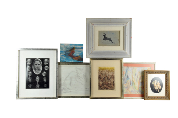 Lote de obras gráficas y pictóricas. Consta de: a) Ernst Saemisch. Restos de galeón. Óleo sobre tela. Firmado y fechado 1956. Referido al reverso. Dimensiones: 20 x 25 cm. b) Firma ilegible. Paisaje cósmico # I. Grabado, serie P/A. Firmado y fechado 78. Dimensiones 24 x 17 cm. c) Anónimo. Medallón con rostro femenino y girasoles. Dimensiones: 32 x 25 cm. Entre otros. Algunos enmarcados. Presentan ligeros detalles de conservación y humedad. Piezas: 7 Estimado $500-800