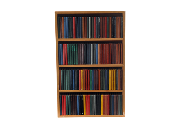 Colección de libros "El Parnasillo" Antología poética, del castellano antiguo al siglo XX. Dueñas, Palencia: Simancas Ediciones, 2002. Libros miniatura en librero de madera. Encuadernados en pasta dura en piel. Piezas: 116 Estimado $2,500-3,500