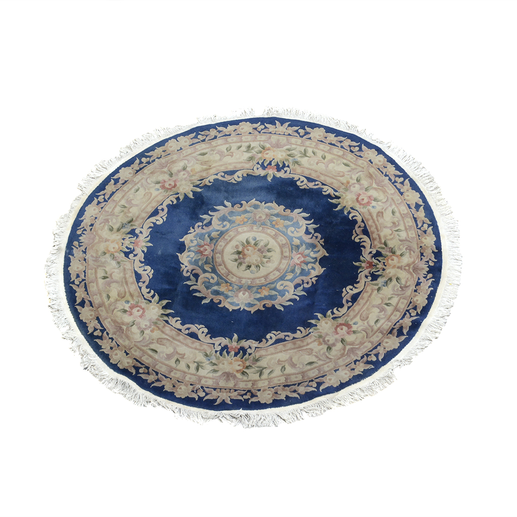 Alfombra china. Siglo XX. Diseño circular. Elaborada en lana y algodón. Decorada con motivos florales, orgánicos y medallón central en colores beige y café sobre fondo azul. Presenta detalles de conservación, marcas y desgaste. Dimensiones: 215 cm. Ø Estimado $1,300-1,500
