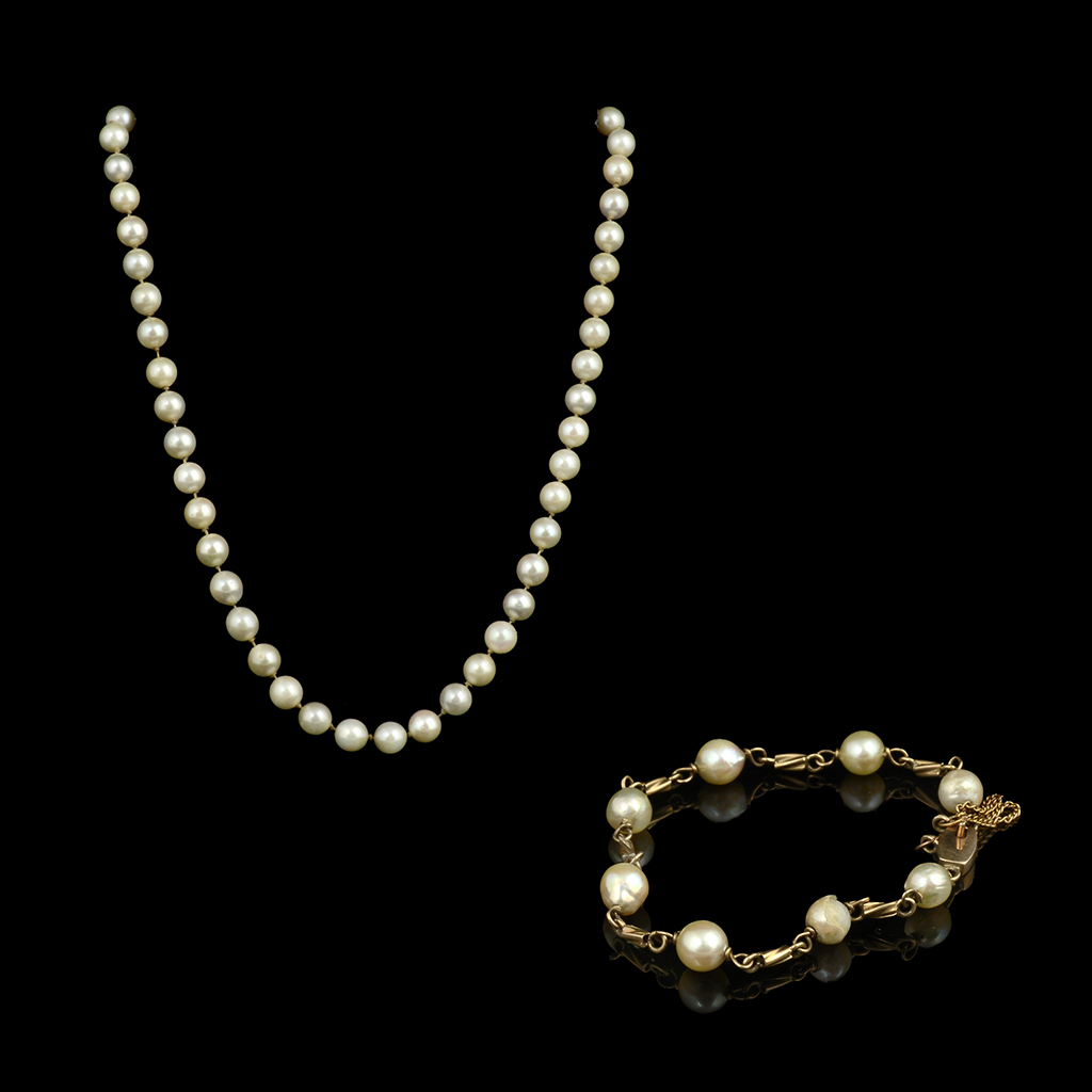 Subasta 823T, Lote # 143 Collar y pulsera. Con perlas y broche en oro de 14k. Presentan perla fisurada y restaurada. Peso: 18.5 g. Piezas: 2 Estimado $2,200-3,000