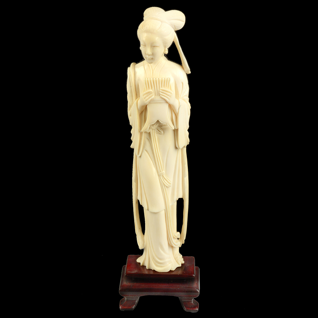 Dama oriental con tocado y flauta. China. Siglo XX. Talla en marfil. Con base. Presenta ligeros detalles de conservación. Dimensiones: 24 cm. Estimado $6,000-10,000
