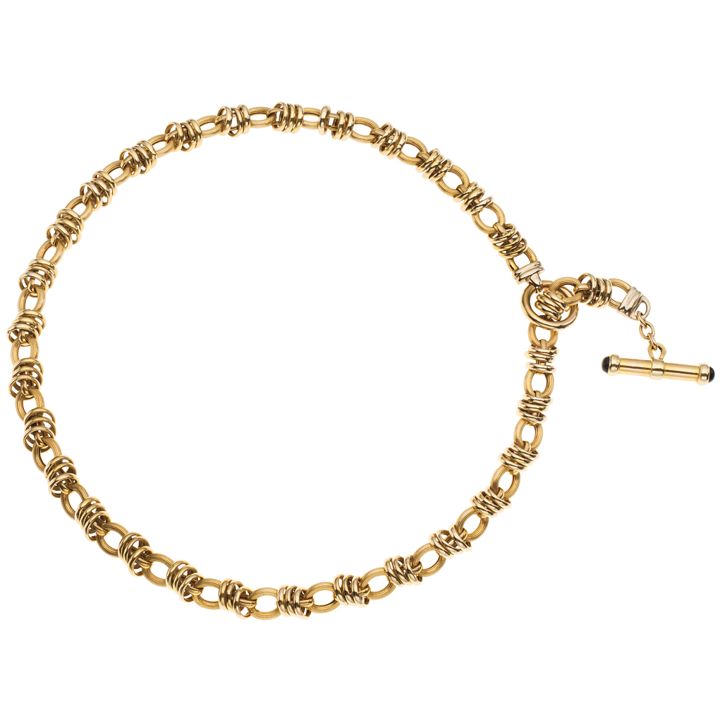 Collar de eslabones ovales y circulares con broche de aro y barra decorado con cabujones de obsidiana. Terminado texturizado y brillante. Peso: 48.6 g. Largo: 50.5 cm aprox.