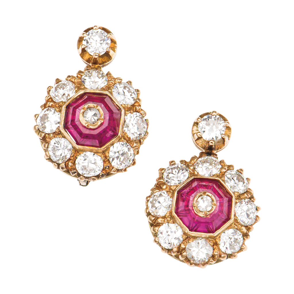 Subasta 779, Lote # 111 PAR DE ARETES CON DIAMANTES EN ORO AMARILLO DE 18K Aretes decorados con diamantes engastados y cristales rosas al centro. Terminado semibrillante. Gancho y pestillo. Peso: 6.2 g. Tamaño: 1.3 x 1.8 cm 20 Diamantes corte antiguo y corte 8x8 ~1.80 ct Claridad: SI1 - SI2 Color: I Estimado $22,000-30,000