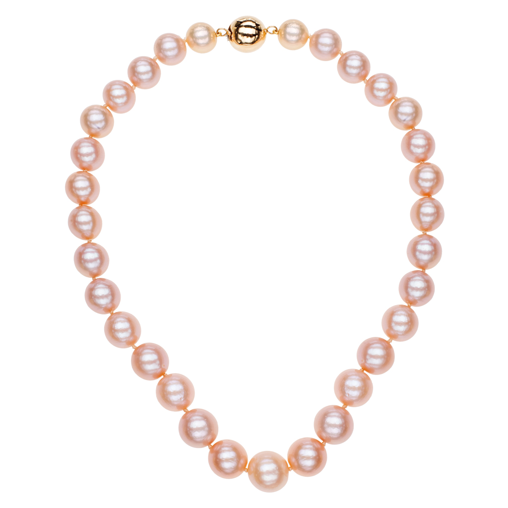31 Perlas cultivadas de los Mares del Sur Tamaño: 12.5 - 14.0 mm Forma: esférica Color: rosa salmón Sobretono: rosa Lustre: muy bueno Punteado: menor a visible Espesor del nácar: grueso Mezcla: buena