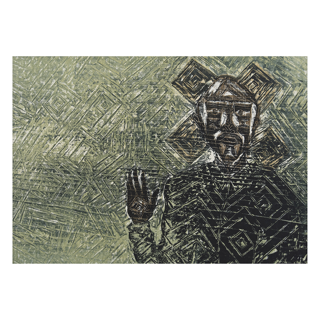 FRANCISCO TOLEDO (Juchitán, Oaxaca, 1940 - ) Autorretrato saludando Firmada al reverso Xilografía 3 / 40, numerada también al reverso 30.5 x 43 cm Estimado $15,000-20,000