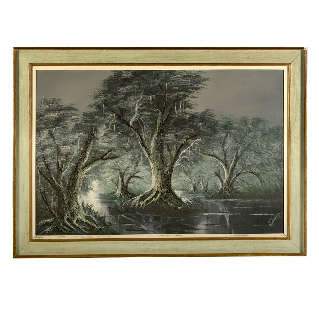 Firmado Rodríguez. Siglo XX. Paisaje lacustre. Óleo sobre tela. Fechado 62. Enmarcado. Presenta detalles de conservación y marcas. Dimensiones: 99 x 149 cm. Estimado $3,500-4,000
