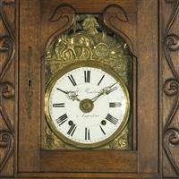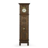 Reloj Grandfather. Francia. Siglo XX. Marcado J-Ci. Rambaud à Angoulème. Caja de madera tallada de roble. 2 puertas con vidrio y soportes compuestos. Mecanismo de cuerda, péndulo y contrapesos, sin llave. Carátula metálica, índices romanos y manecillas caladas. Decorado con roleos y motivos florales. No funciona. Presenta detalles de conservación, de estructura, fisuras, marcas, desgaste y requiere servicio. Dimensiones: 235 x 64 x 41 cm. Estimado $ 10,000-12,000