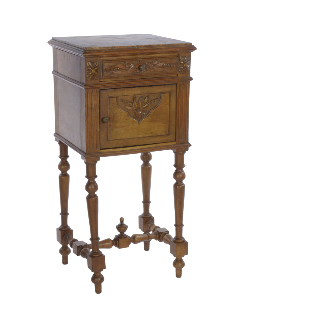Con cubierta de mármol veteado, puerta, cajón, chambrana en "H" y soportes tipo bollo.