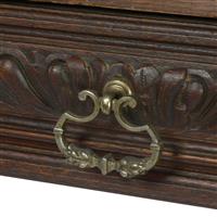 Con cubierta abatible, recubrimiento de mármol veteado, 2 cajones, entrepaño inferior y soportes tipo bollo.