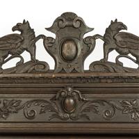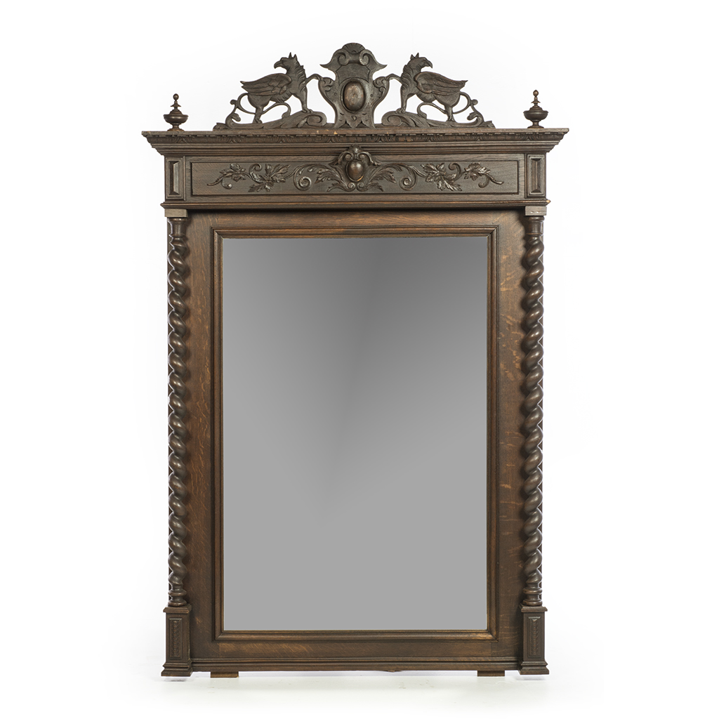 Espejo. Francia. Siglo XX. Marco de madera tallada de roble. Luna rectangular biselada. Decorado con remate con cartela flanqueada por seres fantásticos, pináculos, columnas torzales, roleos y motivos vegetales. Presenta detalles de conservación, apolillado, fisuras, ligeros faltantes, marcas y desgaste. Dimensiones: 190 x 125 cm. Estimado $ 5,000-7,000