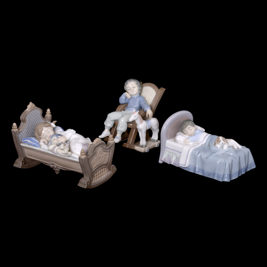 Figuras decorativas. España. Siglo XX. Elaboradas en porcelana Lladró, acabado brillante. Diferentes diseños y tamaños. Consta de: Dormidito en la mecedora, dormiditas en la cuna y amiguitos agotados. Presentan detalles de conservación. Dimensiones: 12 x 16.5 x 10 cm. (mayor). Piezas: 3 Estimado $ 2,000-2,500